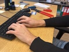 Dieser moderne Bürotisch mit Glasoberfläche und passendem Korpus ist aufgrund Umzugs abzuholen. Masse Schreibtisch: -…